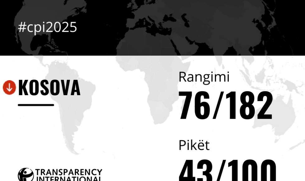 Prishtinë, 10 shkurt 2026 – Transparency International publikoi sot Indeksin e Perceptimit të Korrupsionit (CPI) për vitin 2025, i cili mat perceptimin e korrupsionit në 182 shtete të botës, duke u bazuar në të dhëna nga burime të pavarura ndërkombëtare, përfshirë Bankën Botërore, World Economic Forum dhe organizata të tjera globale kredibile.